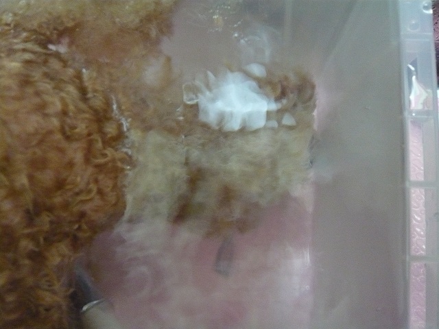 前足の付け根部分は毛玉になりやすいので短くして、その下はボリュームを出し、メリハリのあるスタイルになりました