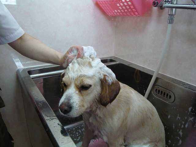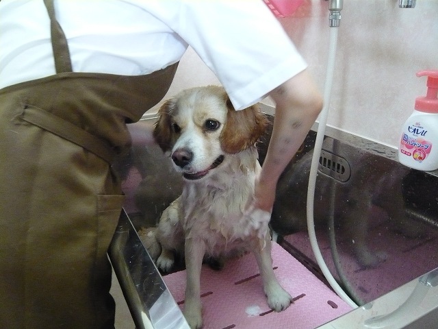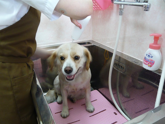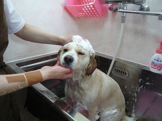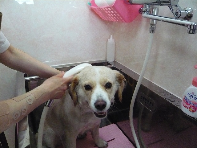 今回はトリミング前の写真を撮り忘れてしまったのですが、途中から助っ人が来てくれたのでシャンプー中の写真が撮れました