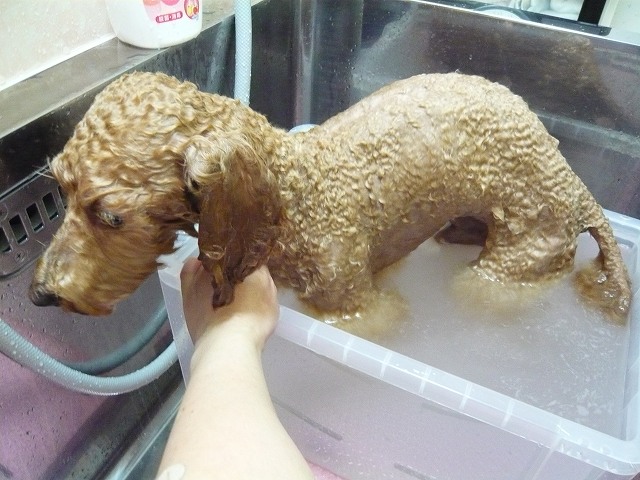 背中は掛け湯して~モコくんお利口に入ってくれました