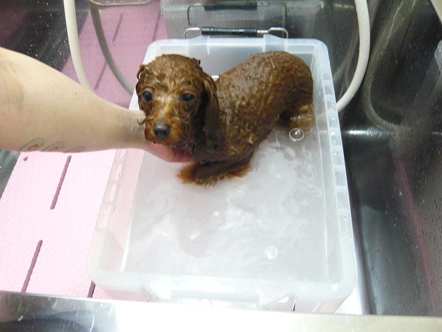 別府温泉天然湯の花エキスが入ったお風呂にも、お利口に入ってくれました
