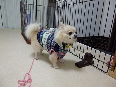 マロンくん、リードも付けて帰る準備は万端です